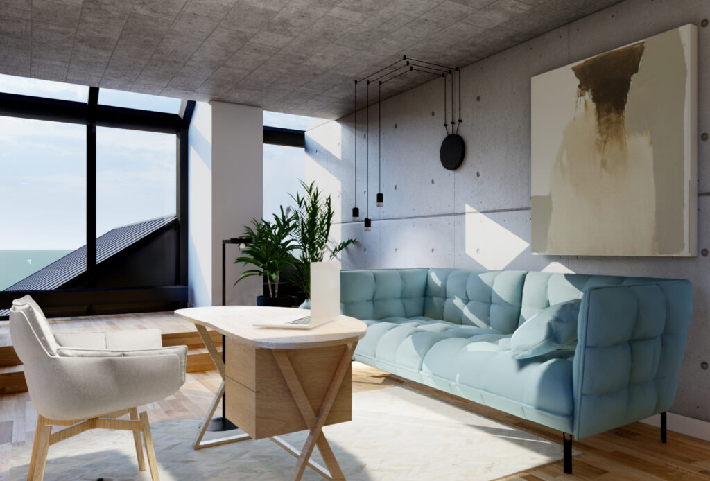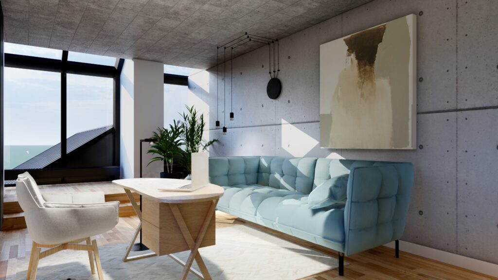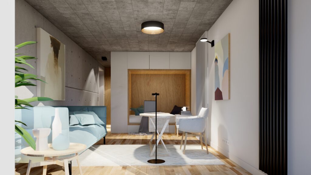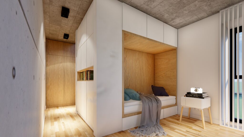 Projekt sypialni przeznaczonej dla córeczki właścicieli willi w podwarszawskiej Magdalence został zaprojektowany wraz z pracownią MWH Architekci Piotr Majewski. Pastelowe akcenty królują w tym wnętrzu dodając mu subtelności i kobiecości. Surowość betonowych ścian powstałych po zdjęciu szalunku została przełamana ciepłym odcieniem naturalnego dębu, błękitem oraz pudrowym różem występującym w niektórych elementach wystroju wnętrza.