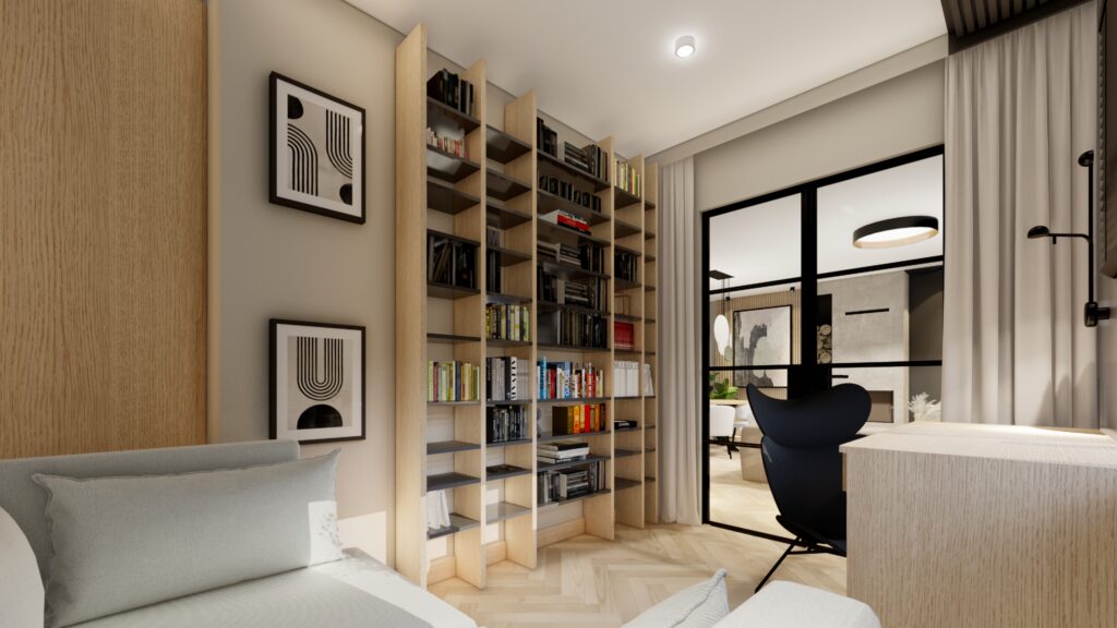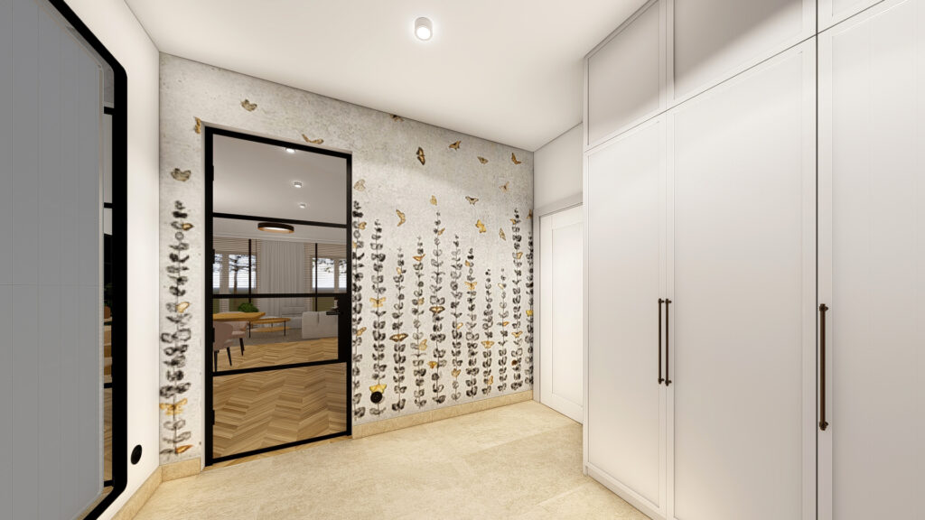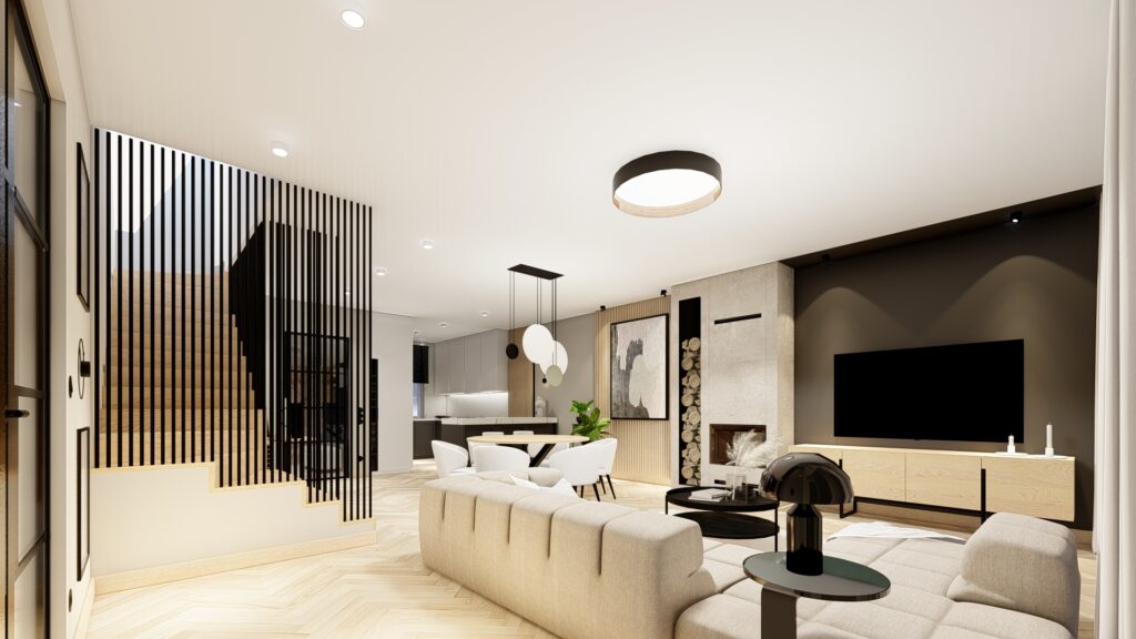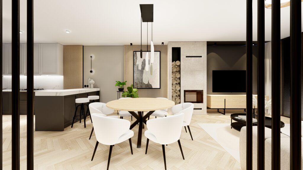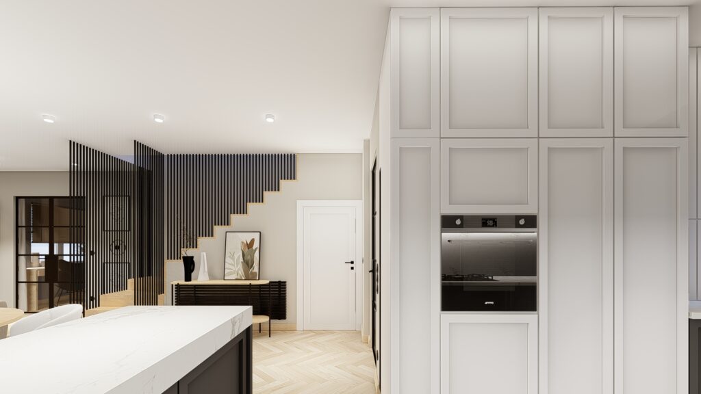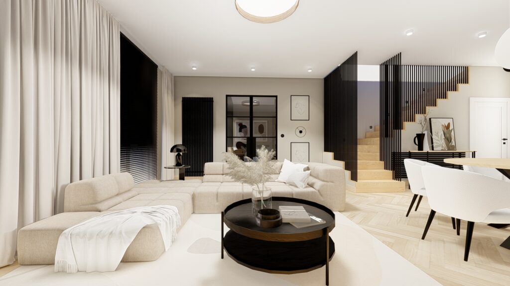 Projekt domu o powierzchni ok. 160 m2 pod Warszawą. Koncepcja zgodnie z założeniami inwestorów, zaprojektowana została w monochromatycznej, jasnej i ciepłej tonacji. Przewodnimi kolorami są beż, czerń, biel wykończenia ścian i mebli wykonane z forniru. Zaskakujące mają być akcenty kolorystyczne występujące w detalach. Użyte materiały są eleganckie i ponadczasowe. Wnętrza emanują spokojem, są spójne koncepcyjnie i służą wypoczynkowi.