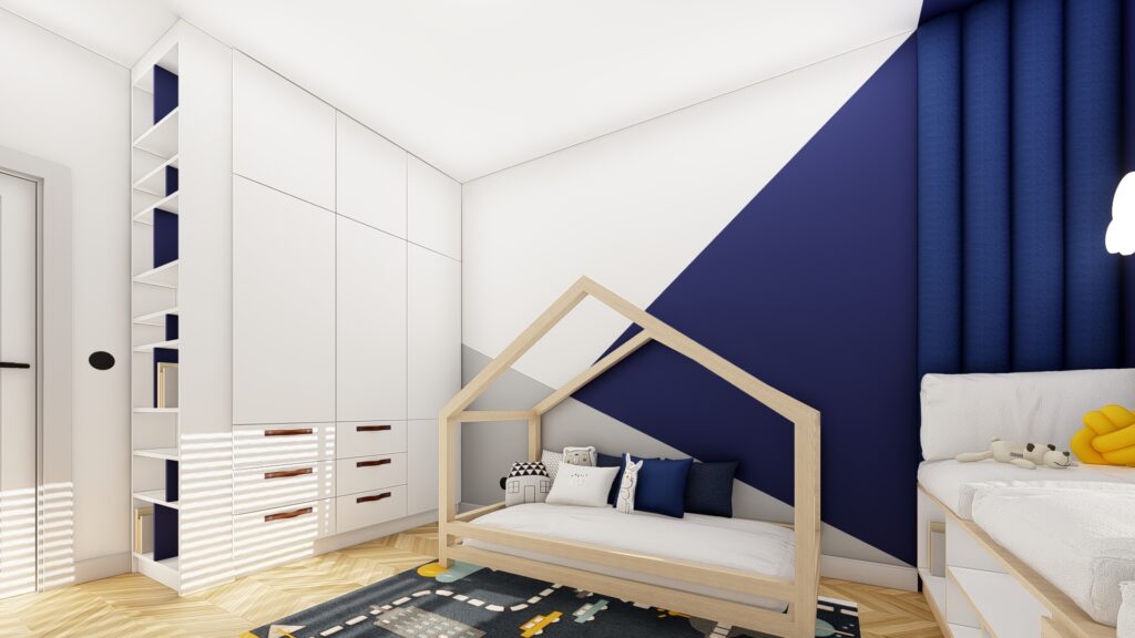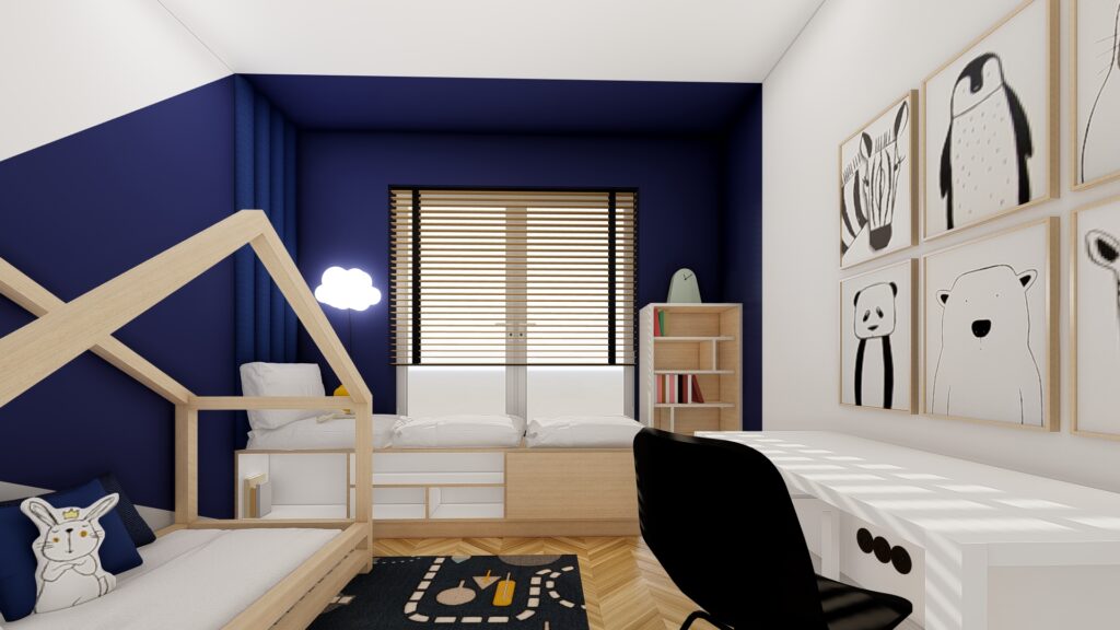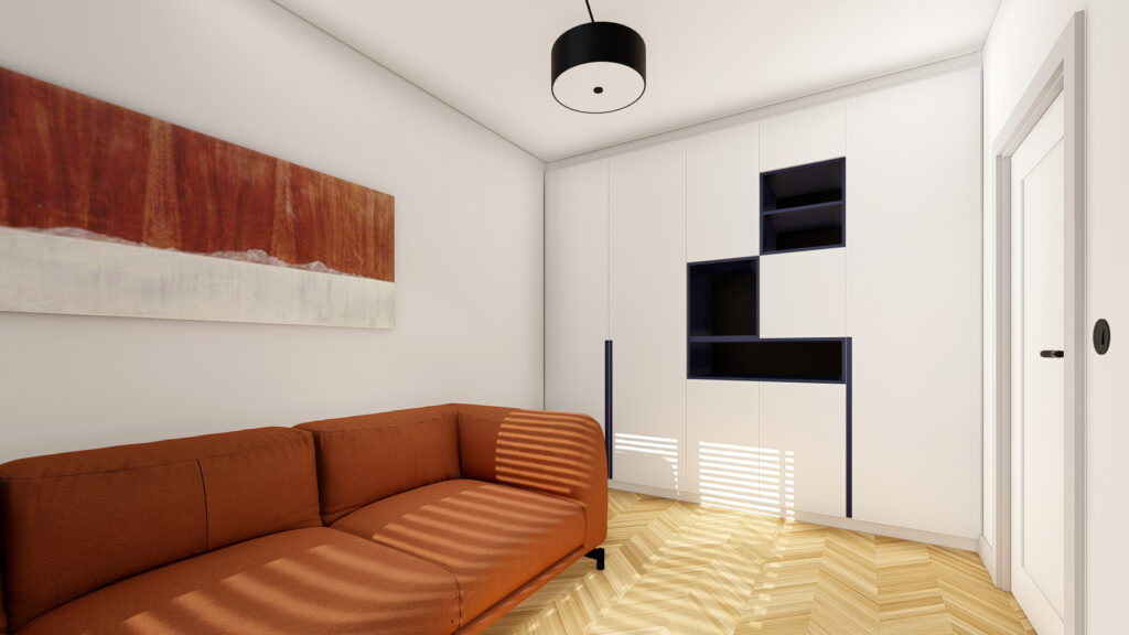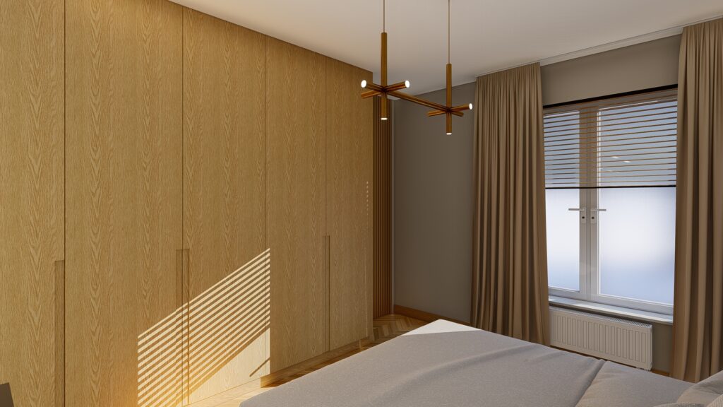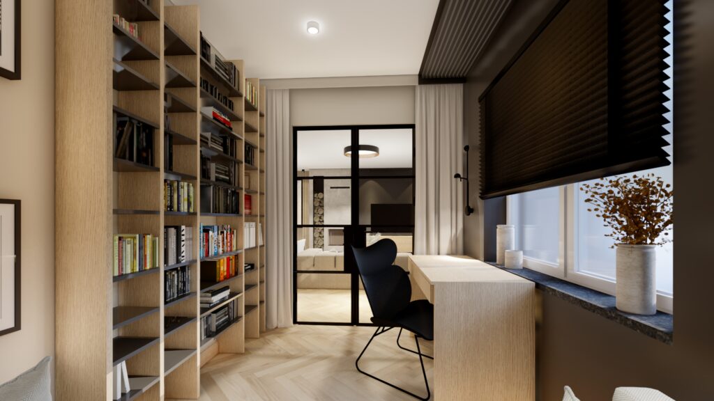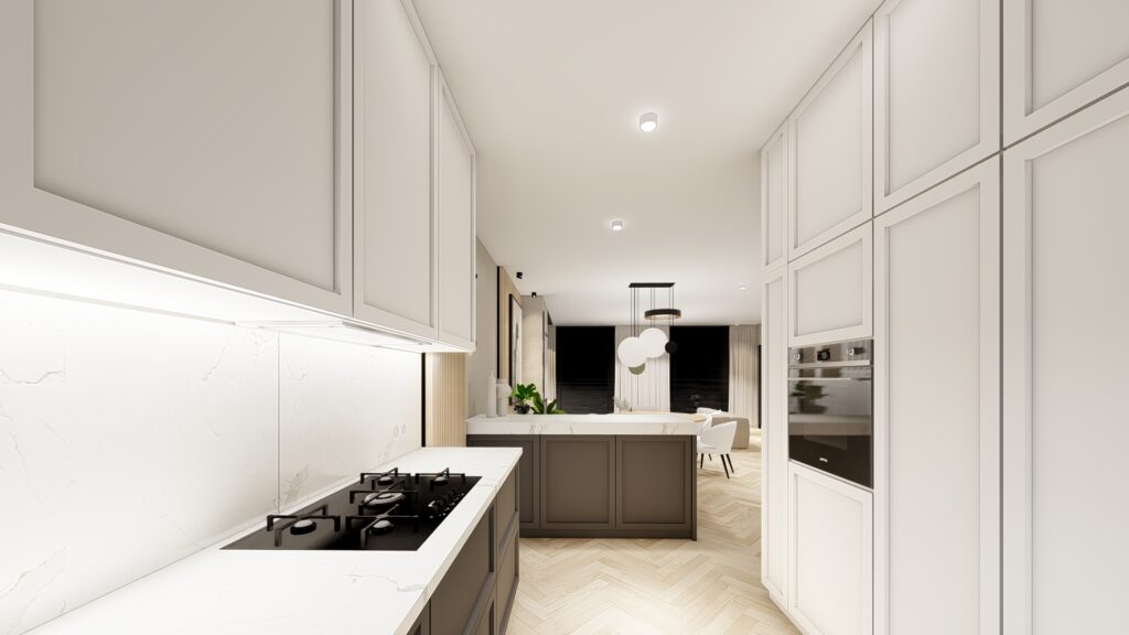 Projekt domu o powierzchni ok. 160 m2 pod Warszawą. Koncepcja zgodnie z założeniami inwestorów, zaprojektowana została w monochromatycznej, jasnej i ciepłej tonacji. Przewodnimi kolorami są beż, czerń, biel wykończenia ścian i mebli wykonane z forniru. Zaskakujące mają być akcenty kolorystyczne występujące w detalach. Użyte materiały są eleganckie i ponadczasowe. Wnętrza emanują spokojem, są spójne koncepcyjnie i służą wypoczynkowi.